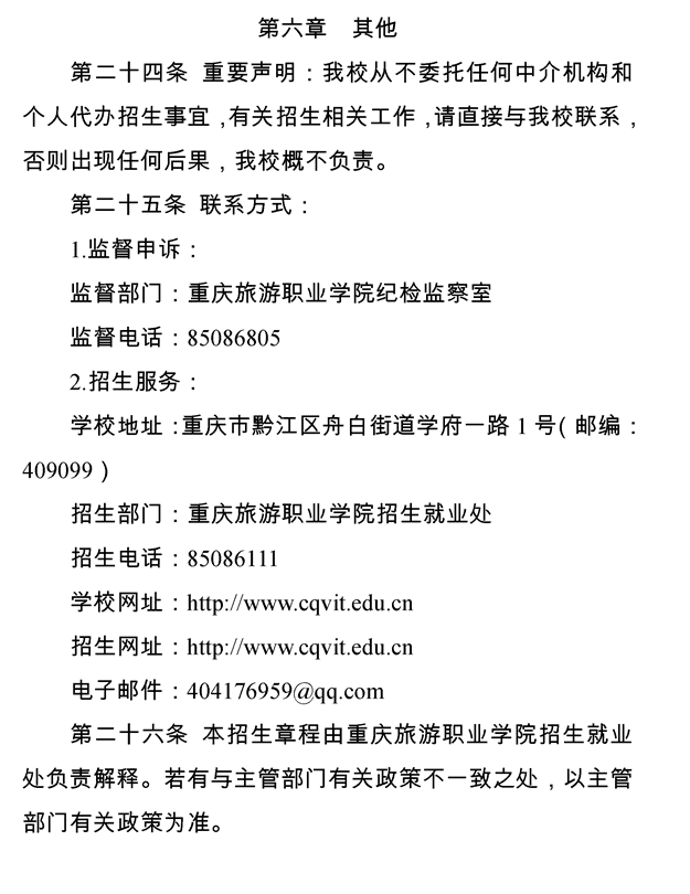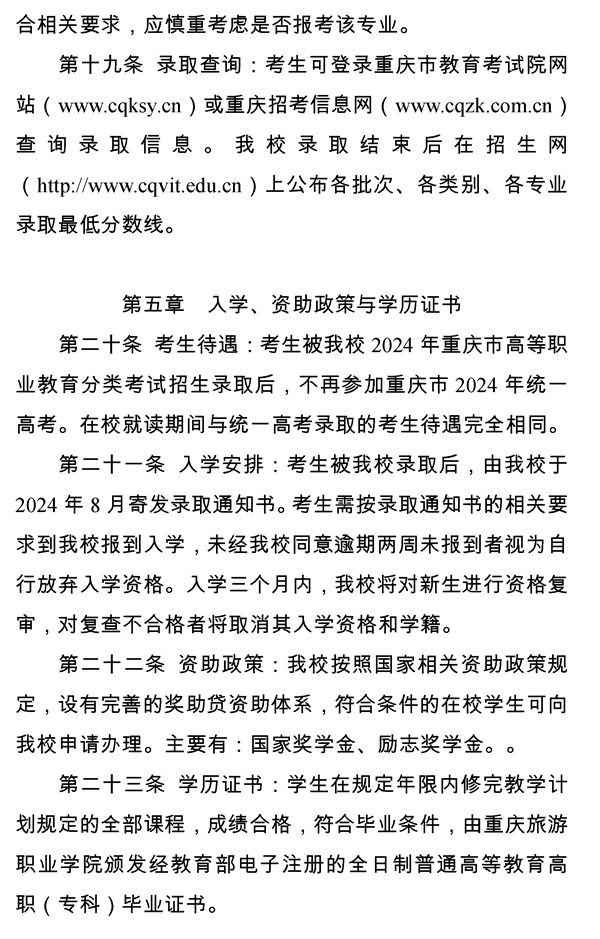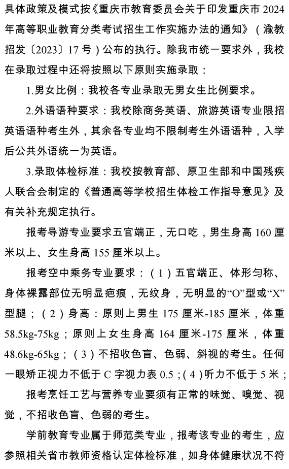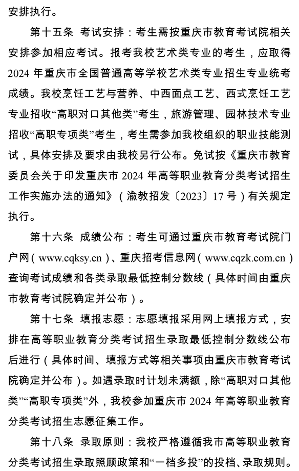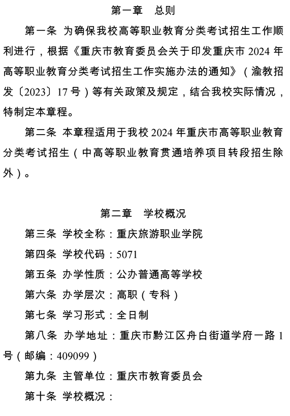 重庆旅游职业学院 2024年重庆市高等职业教育分类考试招生章程